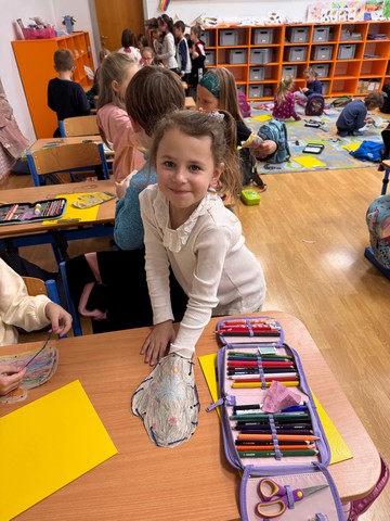 Na závěr jsme se pustili do skupinového tvoření. Inspirovali jsme se módou z 60. let v Americe, kdy lidé začali nosit papírové oblečení, které si sami dozdobovali. Každý si proto vyrobil vlastní papírovou rukavici.