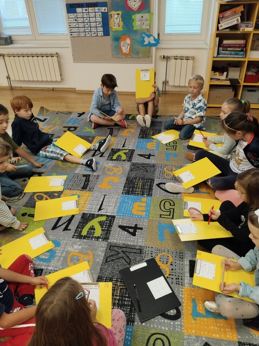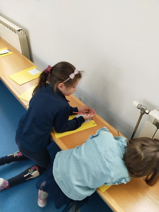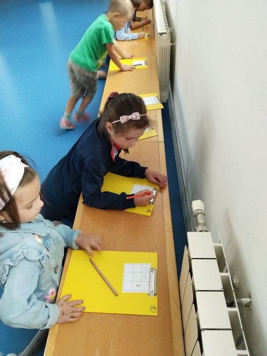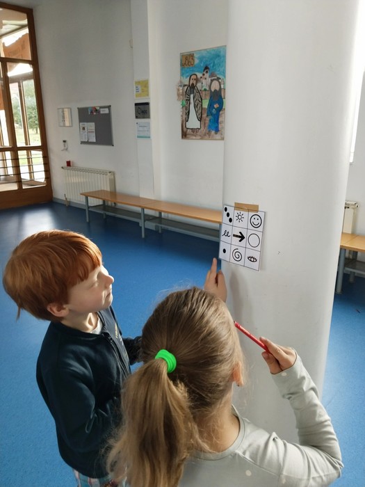 Prvňáci si poprvé vyzkoušeli pamatovák. Aktivita zaměřená na orientaci v tabulce a procvičení paměti na ně netradičně čekala ve vstupní hale školy. Na několika místech byly připraveny tabulky s obrázky, které bylo třeba zaznačit na správné místo do prázdných okýnek.