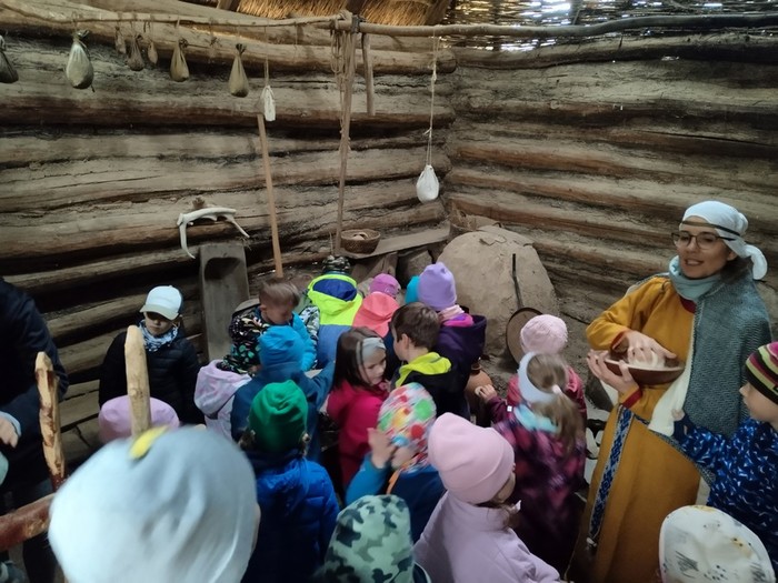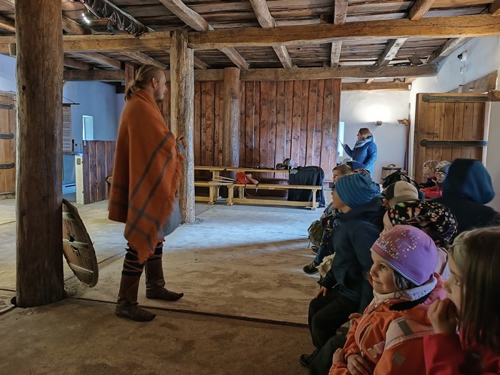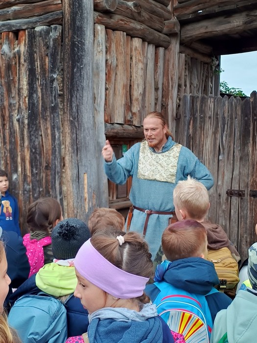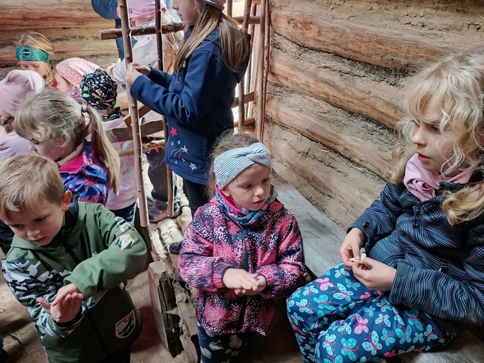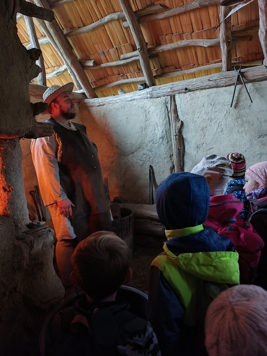 Navštívili jsme také domek, kde jsme si povídali o zpracování ovčí vlny, lnu, ale i o tom, jak se staří Slované oblékali. Také jsme zkoušeli odhadnout, čím se daly obarvit lněné látky a zkoumali jsme šperky a doplňky, kterými se lidé zdobili.