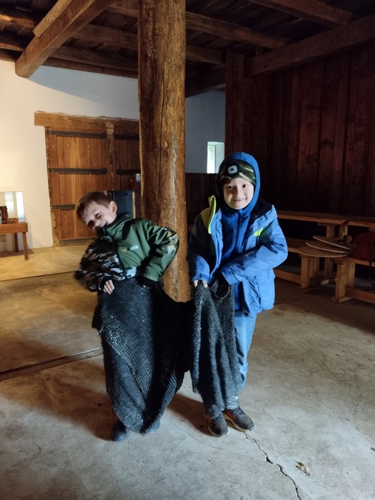 Ve velmožském paláci jsme nahlédli pod pokličku řemeslům, která souvisela s válečnictvím. Prvňáci měli za úkol podat kroužkovou košili. Ta byla ovšem tak těžká, že ji dva téměř neunesli. Její výroba byla velmi finančně náročná. Funkce takové košile však byla nedocenitelná.