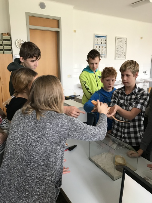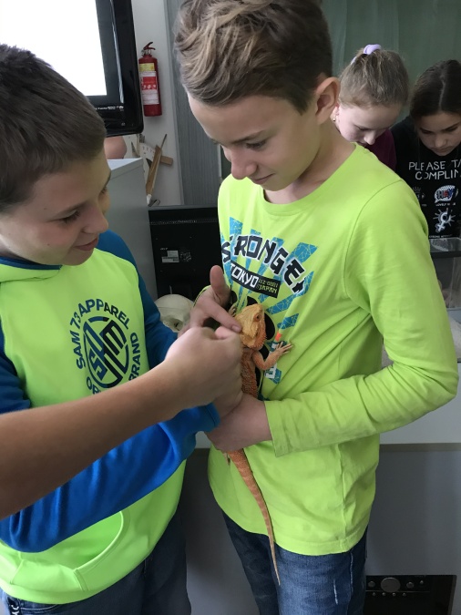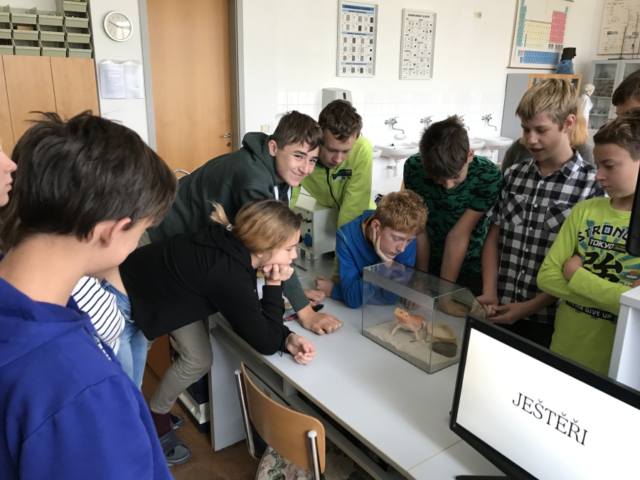 Do páteční hodiny přírodopisu přinesl Igor Stránský svého domácího mazlíčka, kterým není nikdo jiný něž Agáta, což je jméno pro agamu vousatou. Tímto Igorovi děkujeme za ochotu a velmi obohacující praktickou ukázku.