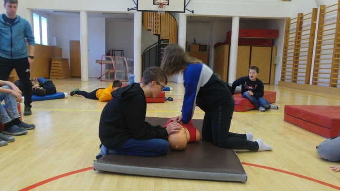 Žáci si zopakovali základy první pomoci. Ve dvojicích si nacvičili stabilizovanou polohu. Na figuríně si sami mohli vyzkoušet masáž srdce, při níž zjistili, že to není vůbec jednoduché.
