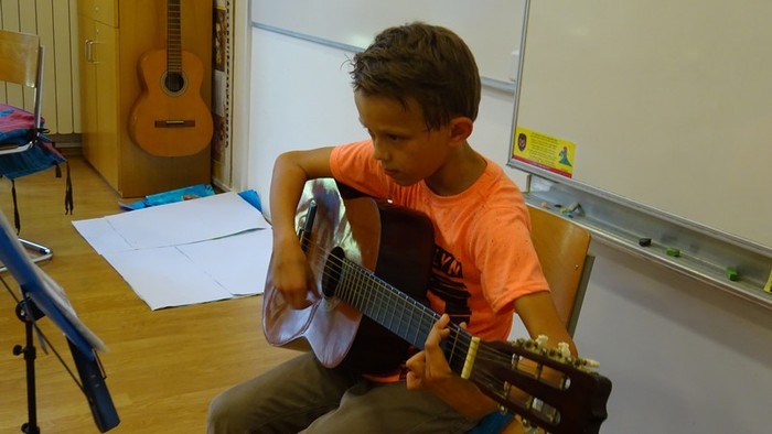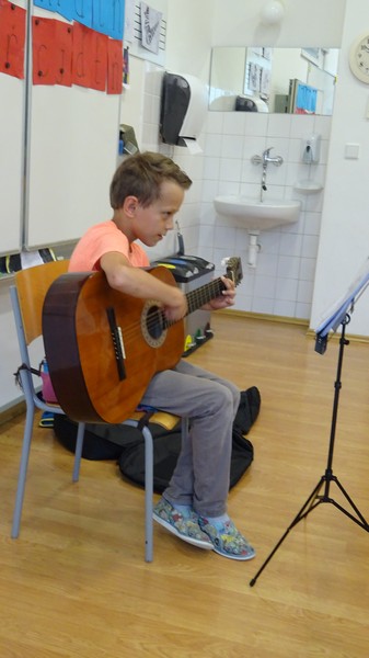 Lukáš se už jeden rok učí hrát na kytaru. Ve třídě spolužákům předvedl, co už umí. Máme ve třídě dalšího nadějného muzikanta! To bude kapela, až to všichni dáme dohromady!