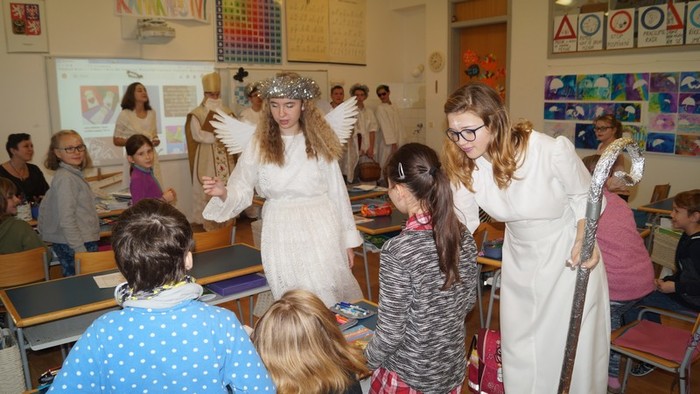 Dnes škola žila Mikulášskou družinou. Mikuláš vyznamenal hodné děti, napomenul ty zlobivé, andělé nás obdarovali drobnými sladkostmi, čerti počmárali, zatančili jsme si s čertovskou kapelou a nakonec jsme si vyrobili vlastní malé papírové peklo s mnoha veselými čerty.