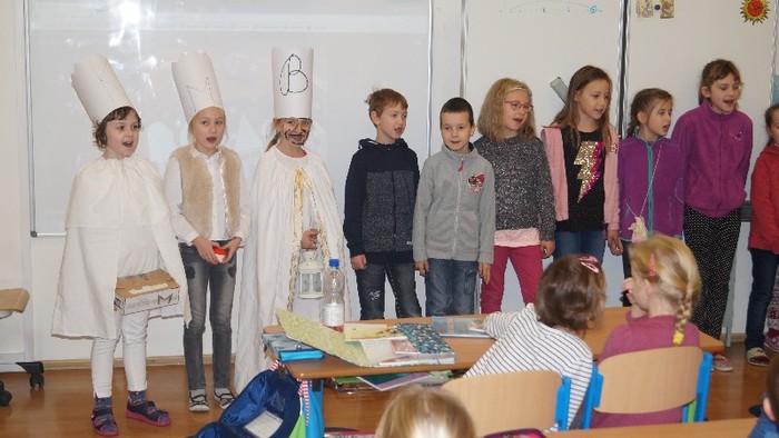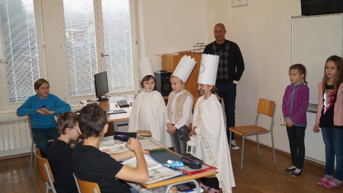 Stejně jako vloni si Ellenka, Julinka a Terezka připravily kostýmy na tříkrálové koledování. Všechny děti pak pomohly se zpěvem - jsme sehrané hudební těleso. Všichni posluchači byli nadšení: dospělí oceňovali dětskou něžnost a upřímnost, starší žáci trochu záviděli a ti nejstarší - deváťáci naše vystoupení blahosklonně vyslechli.