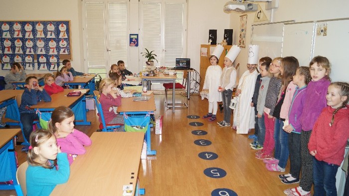 Stejně jako vloni si Ellenka, Julinka a Terezka připravily kostýmy na tříkrálové koledování. Všechny děti pak pomohly se zpěvem - jsme sehrané hudební těleso. Všichni posluchači byli nadšení: dospělí oceňovali dětskou něžnost a upřímnost, starší žáci trochu záviděli a ti nejstarší - deváťáci naše vystoupení blahosklonně vyslechli.