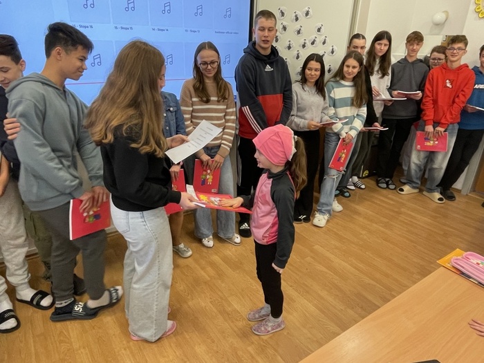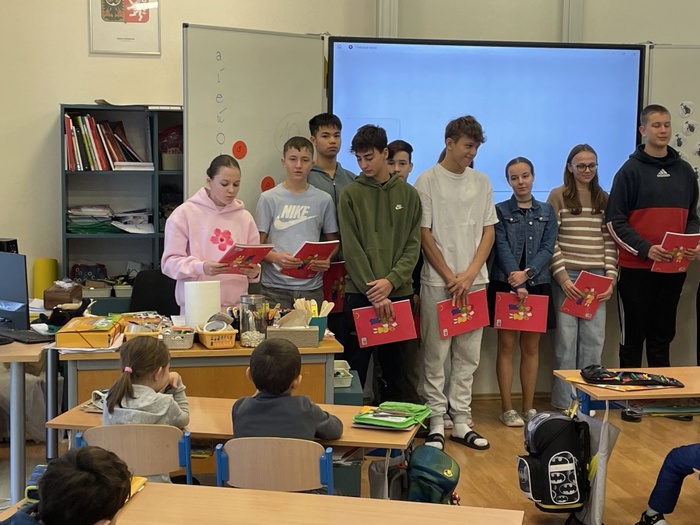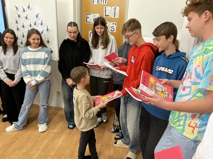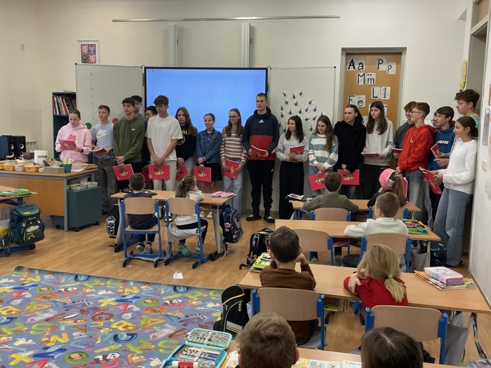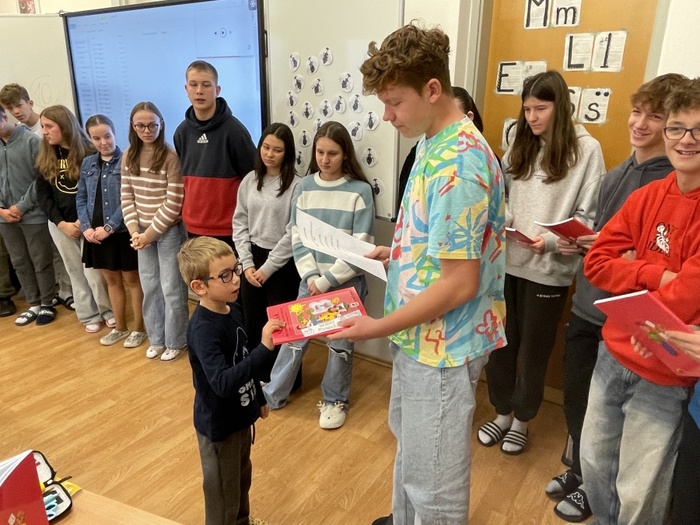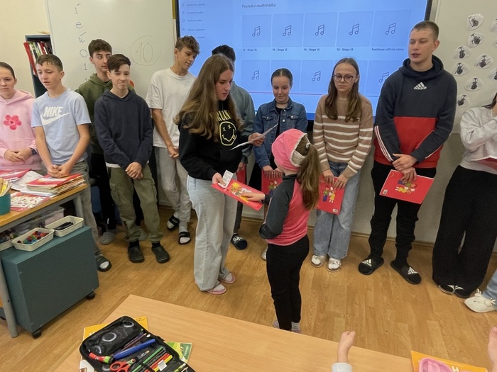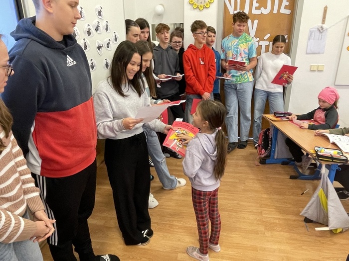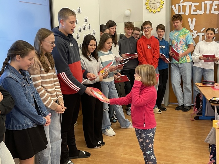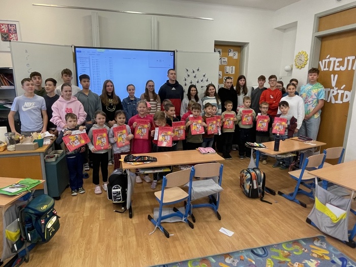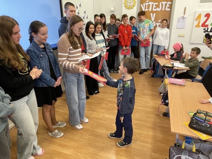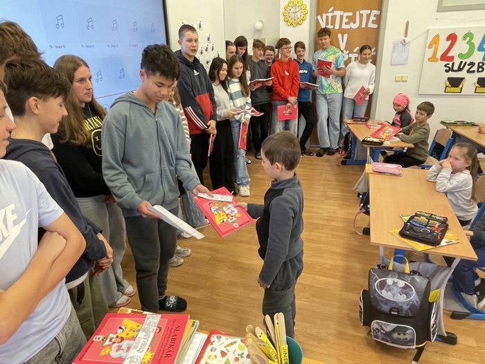 Dnešek byl pro naše prvňáčky opravdu výjimečný! Navštívili je jejich starší kamarádi - deváťáci, kteří přinesli každému prvňáčkovi slabikář. Společně jsme tak zahájili dobrodružnou cestu do světa čtení.