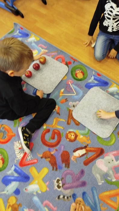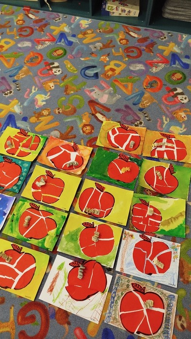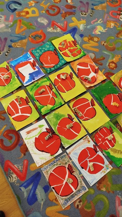 V tomto týdnu bylo našim hlavním tématem jablko. Už v pondělí jsme naše jablka pozorovali, zkoumali jejich tvar, povrch, vůni i chuť. Odhadovali jsme, co se do druhého dne stane s rozkrojeným jablkem, už dokonce i víme, jestli jablko plave, nebo ne. Také víme, z čeho takové jablko vyroste a že to trvá dlouho. S jablky jsme sčítali a porovnávali. Ve středu se nám moc líbilo scénické čtení a taky výroba jablíček z vlny a papíru (hlavně ten červík, který ho rozvrtal). Ve čtvrtek jsme jablíčka otiskovali a taky k nám přiletěl pyšný drak, u kterého jsme se pěkně protáhli. Týden jsme zakončili na stanovištích a také v dílně čtení s knihou Komodo. Draci totiž neexistují jen ti papíroví nebo pohádkoví!