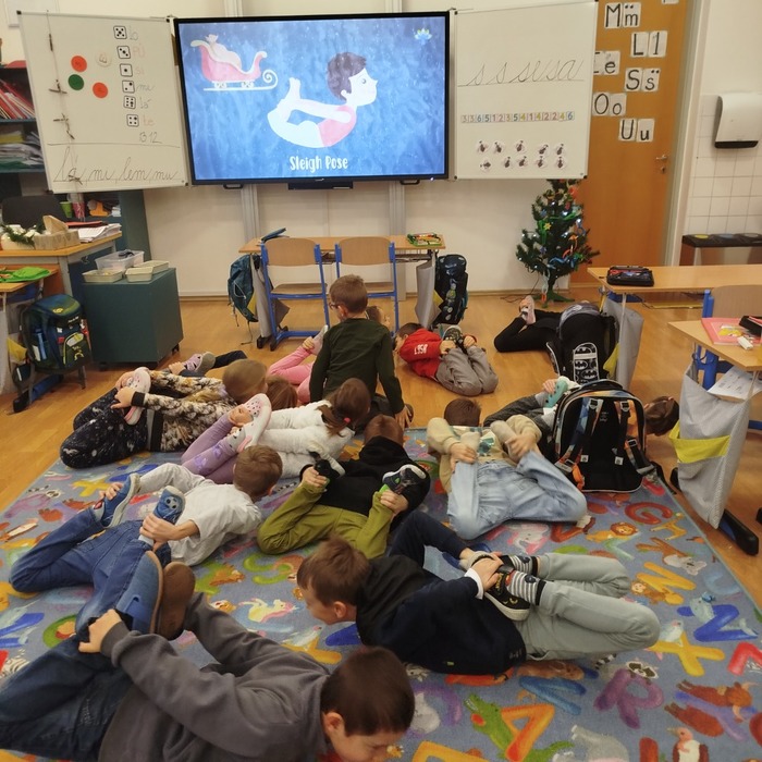 Vyráběli jsme přáníčka, cvičili vánoční jógu, zdobili v tělesné výchově vánoční stromečky, byli na procházce k "našemu" stromu v lese, řešili vánoční úkoly, pekli cukroví s páťáky a sešli se v tělocvičně s celou školou.