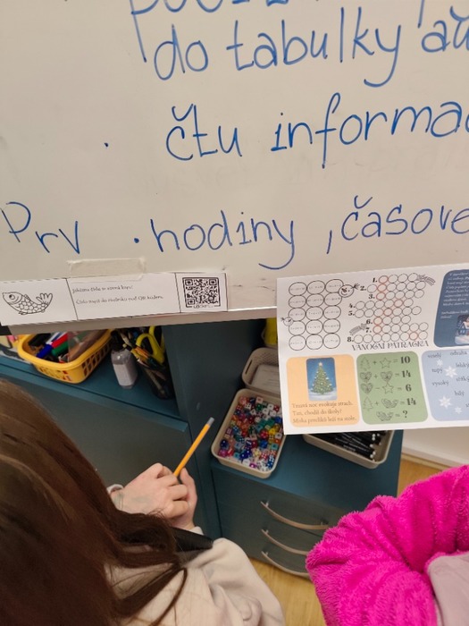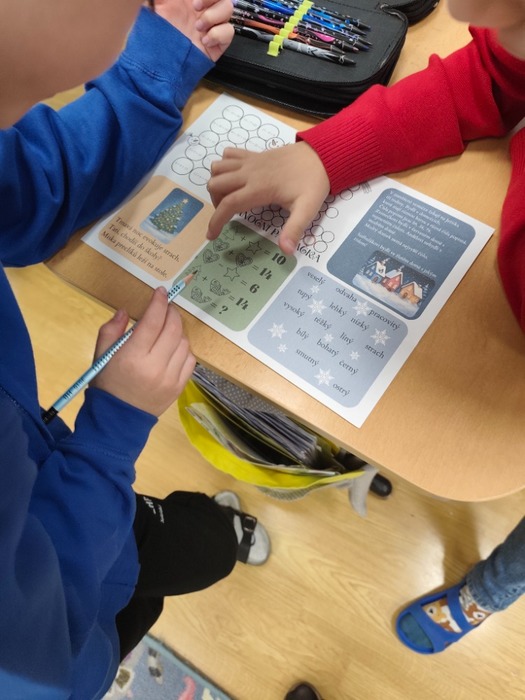 Ve čtvrtek se děti vrhly na vánoční pátračku ve dvojicích, kdy po splnění úkolu odemykaly digitální zámek, který jim prozradil část věty. Po složení šesti slov je věta navedla, že na ně čeká odměna v šatně v bundě...byla sladká.