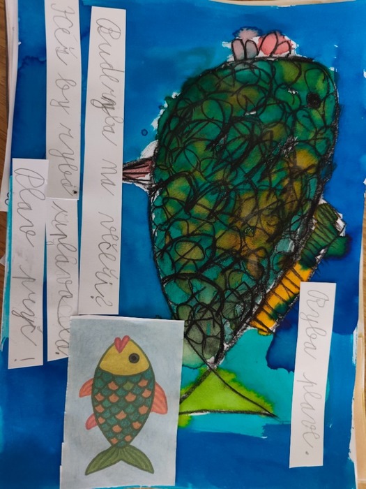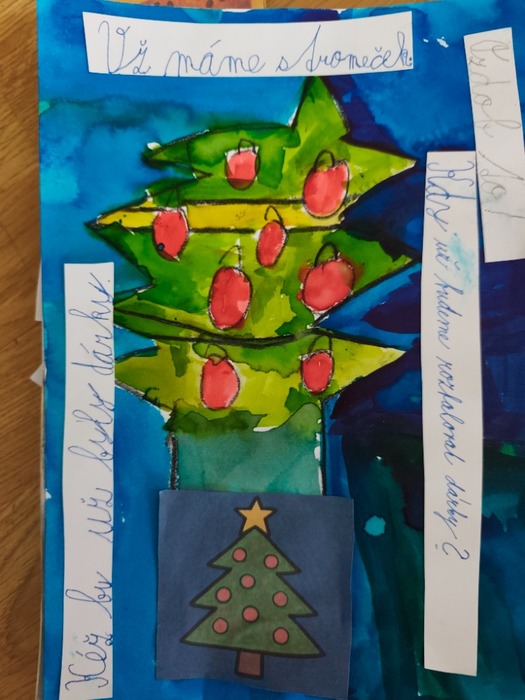 Ve středu jsme si každý vylosovali jeden symbol Vánoc, na symbol jsme vymysleli hádanku. Tento obrázek jsme ve výtvarné výchově nakreslili uhlem a vybarvili vodovými barvami. Druhý den jsme vytvářeli k tomuto obrázku čtyři věty - oznamovací, přací, rozkazovací a tázací. Do chatu GPT jsme paní učitelce nadiktovali, co nejpřesnější popis našeho obrázku, aby nám vygeneroval stejný obrázek.