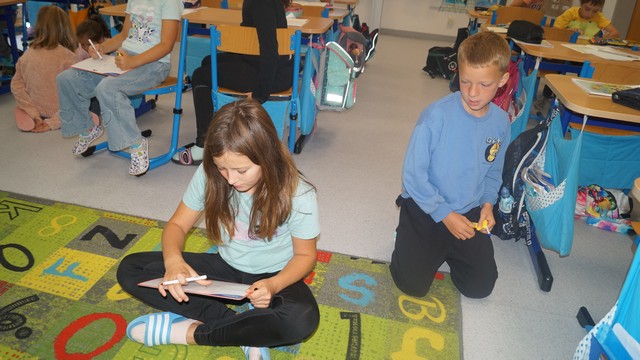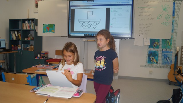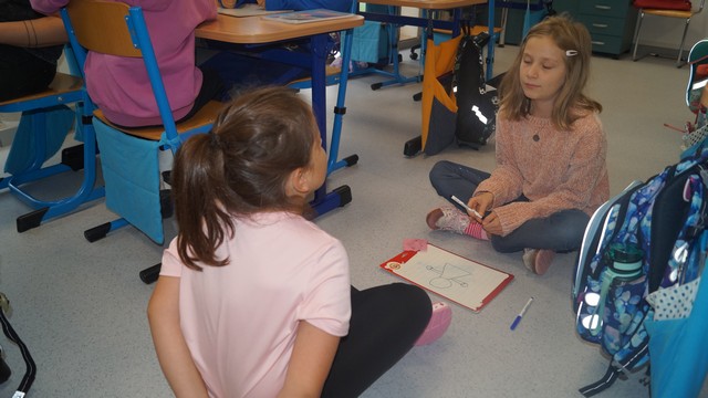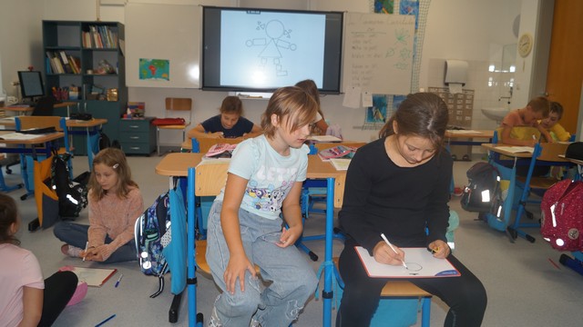 V hodině matematiky jsme si vyzkoušeli netradiční a zábavnou aktivitu, která rozvíjela nejen naši představivost, ale i schopnost přesně se vyjadřovat a spolupracovat. Děti pracovaly ve dvojicích – jeden žák měl před sebou obrázek složený z geometrických tvarů a jeho úkolem bylo ho co nejpřesněji popsat druhému, který podle jeho pokynů obrázek kreslil. Háček byl v tom, že „navigátor“ nesměl ukazovat rukama a kreslíř obrázek předem vůbec neviděl.