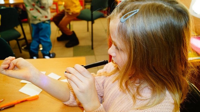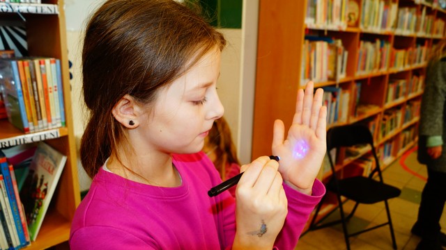 Nakonec si děti nakreslily z pet-lahve své zvířátko, a prý, když ho na Vánoce budou mít pod polštářem a posvítí na něj baterkou, tak obživně (alespoň to tvrdila paní knihovnice). Pak ale speciální kouzelnou baterkou svítily na skryté obrázky. To teprve byla zábava!