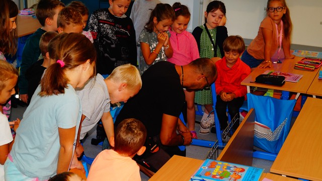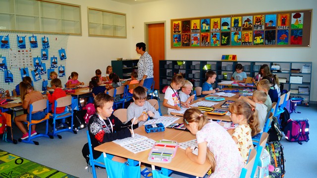 Hned ráno jsme se u pana školníka přiučili, jak se zvětšuje lavice. V matematice jsme si stříhali kartičky na počítání. Nejvíc jsme si ale dnes užili míchání barev ve výtvarné výchově. Den tak utekl jako voda.