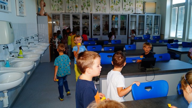 Užili jsme si v tělocvičně, našli jsme rybičky, laboratorní třídu, starší spolužáky a některé sourozence. A hlavně jsme byli za paní ředitelkou v ředitelně.