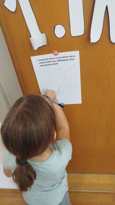Den začal s příběhem o průhledném kocourkovi, vysvětlili jsme si u něj pojem JSI PRO MĚ VZDUCH (každý jej můžeme chápat jinak). Žáci pracovali s textem o vzduchu metodou I.N.S.E.R.T., kde vyhledávali nové informace, nebo informace, kterým nerozumí.