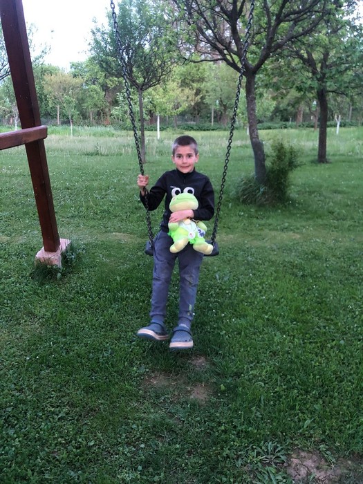 Oba kamarádi si užívali také radovánek na zahradě. Společně se houpali a hráli si s domácím mazlíčkem, jejich pejskem.