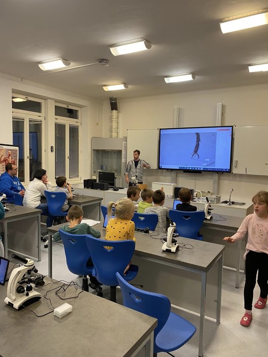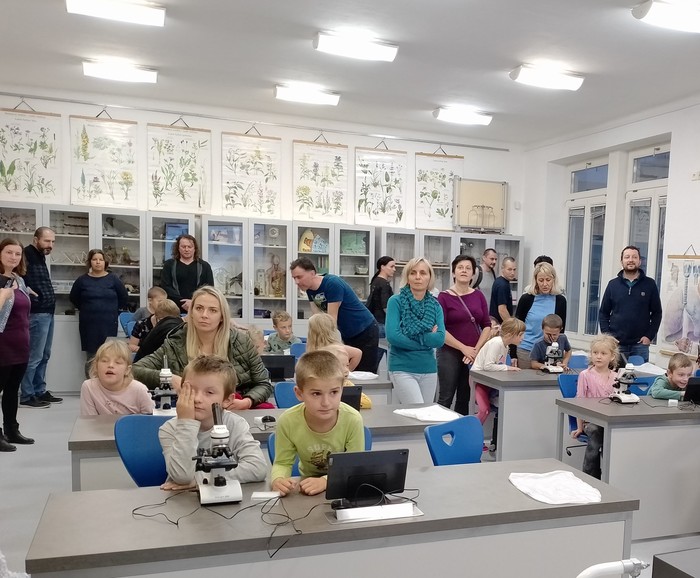 Ale to nebylo vše. Překvapením pro rodiče byla návštěva nové environmentální učebny, která je vybavená novým moderním vybavením. Jak jsou mikroskopy propojené s tablety a jak se jich dá využít při výuce jim předvedl pan učitel Škrášek. Děti si na závěr udělaly na tabuli společně podzimní cvičení.