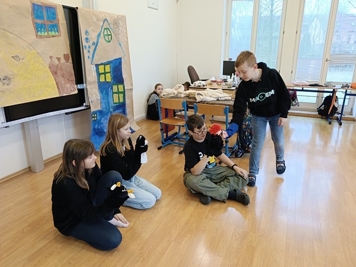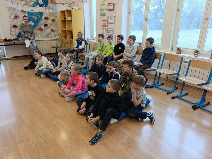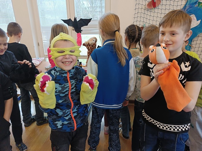 Po představení si druháčci mohli pohrát s maňásky a tak jsme najednou měli ve třídě netopýra, lišku, psa i tříhlavého draka.