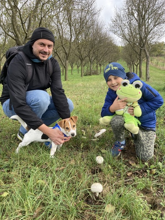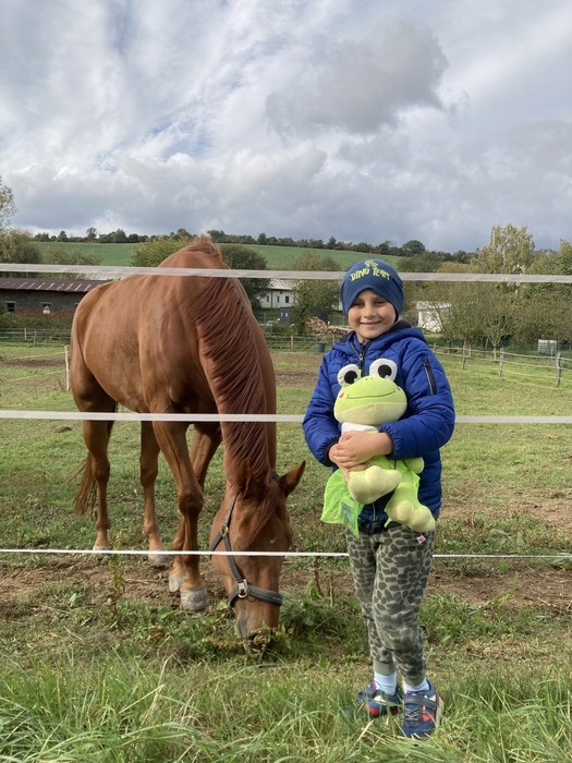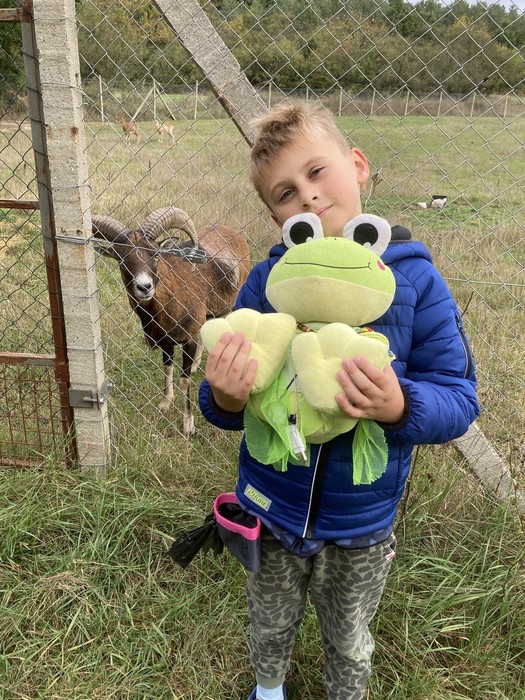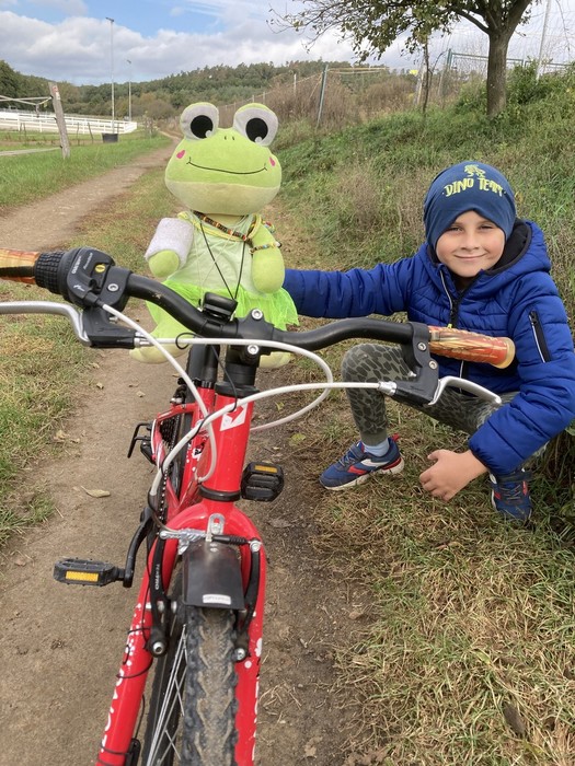 Tentokrát žabka Evelínka trávila víkend na Modré u Matouška. Počasí bylo velmi vlídné a tak trávili společný čas hlavně v přírodě. Společně se vydali na projížďku na kole a vyrazili směrem ke hrázi. V bývalém zemědělském družstvu nyní chovají koně, kteří jsou k vidění na tamních pastvinách. Dokonce v těsné blízkosti výběhu objevili několik žampionů.
