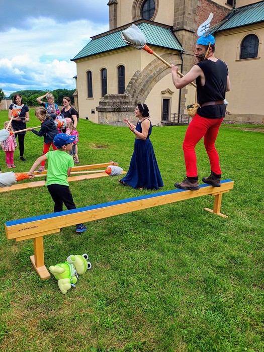 V sobotu dopoledne jsme společně hráli deskovou hru Karak, pekli bábovku, vařili oběd a taky trochu uklízeli. Na oběd jsme si pochutnali na tvarohových knedlících s nasbíranými jahodami. Odpoledne jsme se vypravili na dětský den s tématem „Asterix a Obelix a olympijské hry“. Z této akce byla nadšená Evelínka i kluci i paní psycholožka. Na startu po zapálení olympijského ohně si Evelínka užila chvilku klidu na hoře Olymp, bájném sídle řeckých bohů. Potom se přidala ke klukům a společně skákali do dálky, házeli divočáky Obelixovi do břicha, bojovali s Asterixem, svezli se na loďkách na rybníce, jezdili na koloběžce, na koni, opekli si špekáček a užili si spoustu zábavy v pěně, kterou připravili hasiči. Potkali jsme spoustu známých tváří – třeba Bolečka, Aničku, Zlatušku a další.
