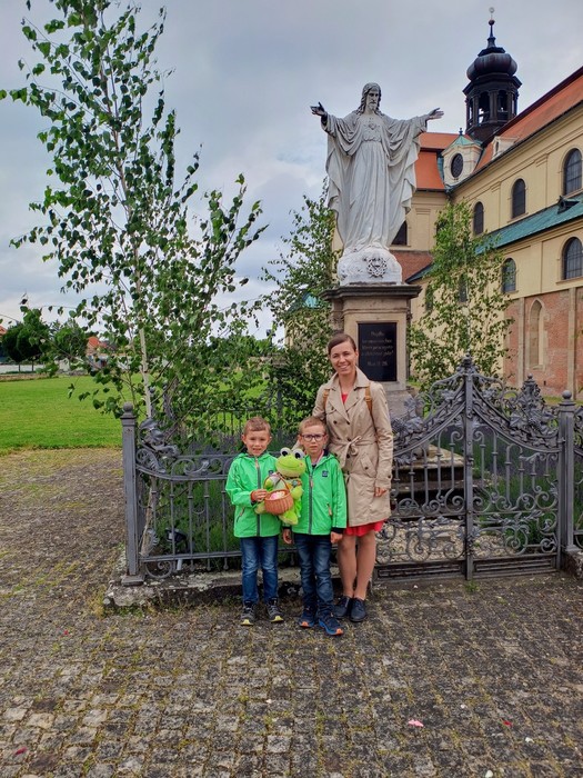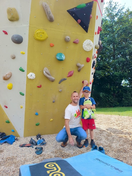 V neděli jsme vzali Evelínku na mši do baziliky a venkovní průvod po nádvoří. Odpoledne jsme se byli podívat na exhibiční lezení na boulderingové stěně „Velehradském krystalu“ pod odborným vedením pana Tomáše Pilky, se kterým se Evelínka stihla i vyfotit. Potkali jsme tam Adámka s celou rodinou. Na hřišti jsme si ještě zahráli florbalový zápas dospěláci proti dětem, kde Evelínka potkala další kamarády ze třídy – Marťu a Kubu.
