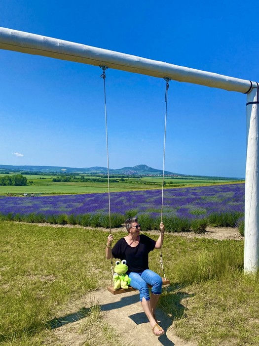 Na oběd si tam dali krásno velkou palačinku s čokoládou a oříšky a vydali se o kousek dál do Staroviček. Je tam jedna z nejkrásnějších levandulových farem a Evelínka nám to jistě potvrdí. Viděla a přivoněla ke spoustě druhů levandulí, odpočívala na sedátku přímo vedle levandulového pole, ochutnala levandulovou limonádu a poseděla si ve fialovém traktoru.