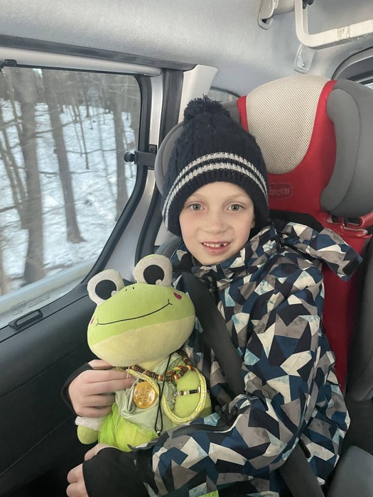 Na zpáteční cestě se Evelínka usadila na palubní desce, natáhla si nožičky, spokojeně celou cestu odpočívala a pozorovala okolí z okna jedoucího auta.
