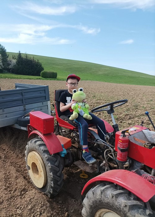 Pomáhali také u babičky a dědečka na poli, kde jezdili s malotraktorem. V dědečkově skleníku pomáhali připravovat půdu k výsadbě, vysazovat a zalévat. Štěpán svou kamarádku žabku seznámil i se psem, který ostražitě hlídá dům a dvůr.