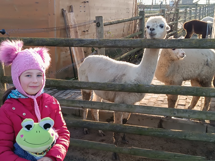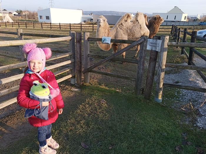 Kromě zvířátek, která už Evelínka znala, na ni na farmě čekala nová, zcela neznámá. Poprvé viděla například lamu nebo klokana. Jeden z nich se zřejmě trošku zalekl, protože se schoval do domečku. Majestátní velbloudi si obě návštěvnice se zájmem pečlivě prohlíželi. Na konci výletu byly obě dvě kamarádky velmi spokojené.