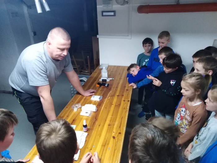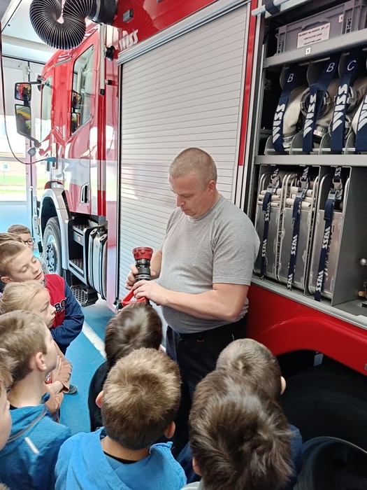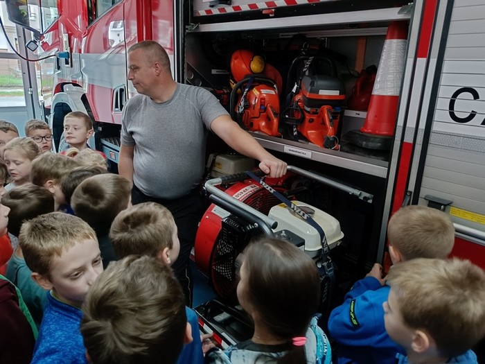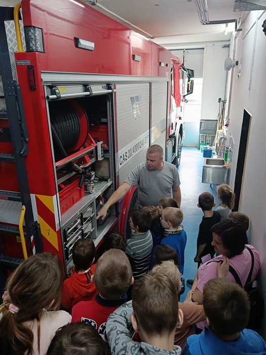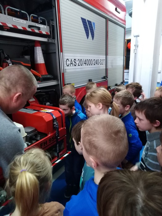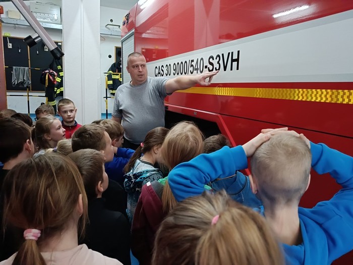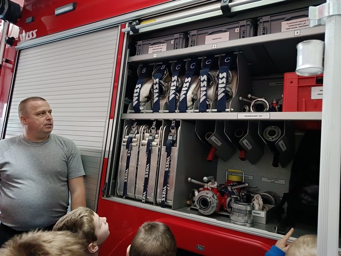 Našim druhákům se opět věnoval Zbyněk Vávra, který je seznámil s hasičskou technikou a vysvětlil, že každé vozidlo je označeno podle toho, k jakému zásahu je určeno, do jakého terénu je vhodné nebo například, zda má potřebné vybavení k chemickým zásahům, případně, jaký objem hasiva uveze.