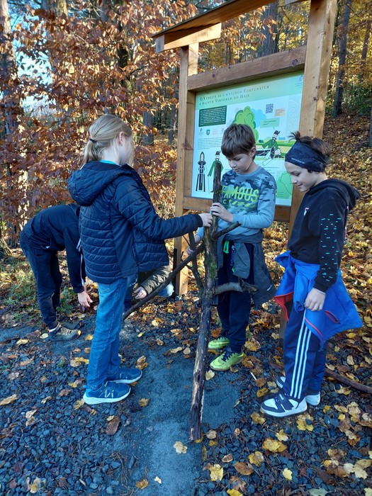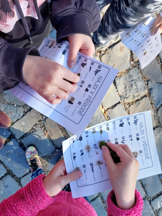 Součástí dne byla také přírodní hledačka. Každý žák měl tabulku se seznamem věcí, které měl v přírodě najít, a místo psacích potřeb používal přírodniny – zabarvil políčko trávou, otiskl mech nebo udělal dírku větvičkou.