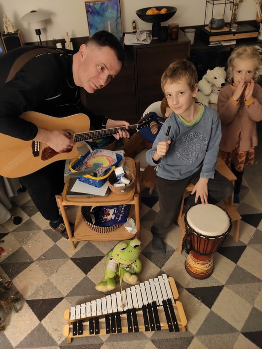 Celá rodina má ráda hudbu a tak se Evelínka seznámila s hudebními nástroji. Sledovala, jak se hraje na kytaru a také si zahrála na ukulele nebo foukací harmoniku. Bubínek, který patří mezi rytmické nástroje, používal zase Marek. A byla z toho malá rodinná kapela.