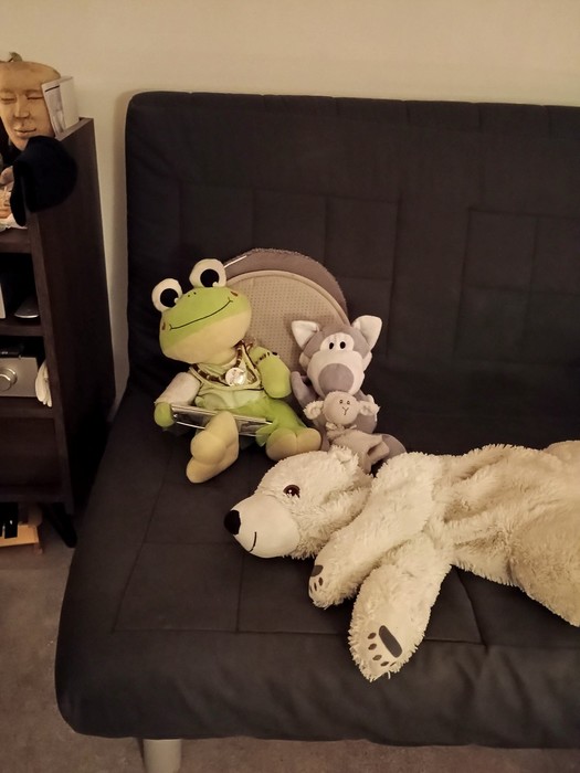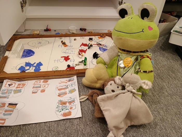 Marek má doma také spoustu plyšových zvířátek a všechny je Evelínce ukázal a povídal jí, jak se který plyšový mazlíček jmenuje. Evelínka se do školy vrátila plná nových dojmů.