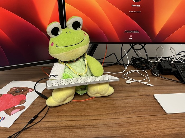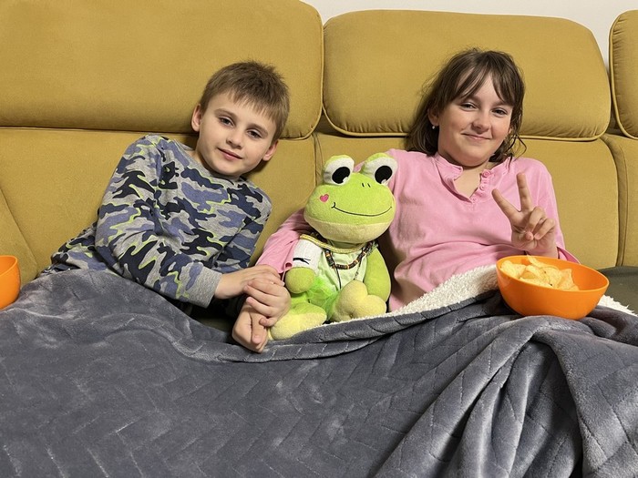 Další víkendové zážitky žabky Evelínky byly ve společnosti Matouška. A bylo toho opravdu hodně. Již páteční odpoledne bylo velmi zajímavé. Evelínka totiž přespala společně s dalšími dětmi ve velehradské knihovně, kde byl připravený krásný program u příležitosti velké akce Noc s Andersenem. V sobotu se také nezahálelo a sázely se stromky a keře v obci Modrá. Společně s kamarády a dospěláky vysadili celkem 60 stromů a 120 keřů. Sobotní večer proběhla pyžamová párty s Matouškem i jeho sestrou Deniskou a nechyběly ani oblíbené brambůrky a promítání. V neděli si pak Evelínka vyzkoušela tatínkovo domácí pracoviště programátora. Na rozloučenou dostala Evelínka od Matouškovy sestry vlastnoručně upletený náramek.