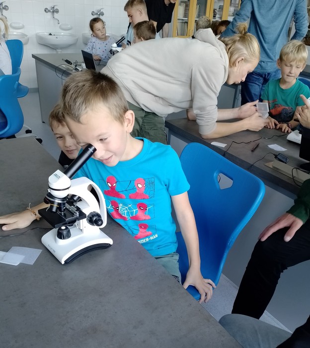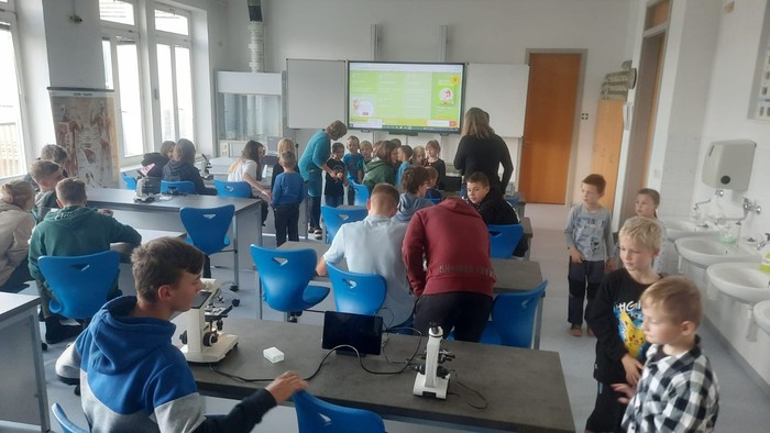 V úterý zase pozvali deváťáci prváky do nové environmentální učebny a předvedli jim práci s mikroskopem a jejich novou interaktivní tabuli. Naši nejmenší žáčci se tak podívali na spoustu zajímavých vzorků, nejvíce se jim však líbil pohled na nohu mouchy domácí.
