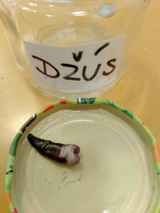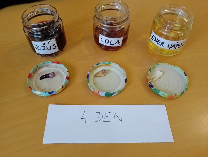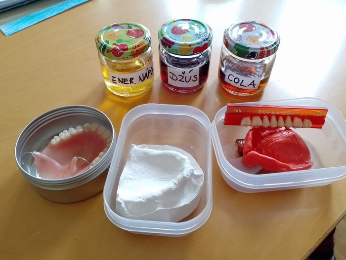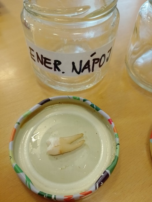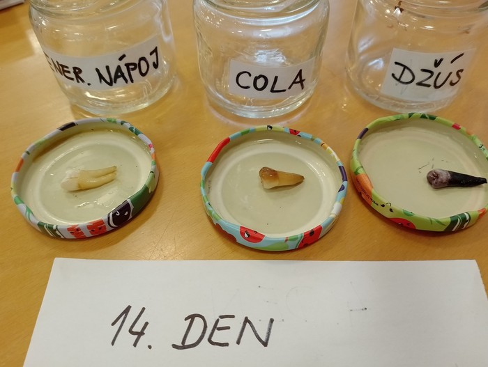 Díky povolání maminky naší Karolínky jsme mohli zrealizovat pokus se zuby. Během 14 dnů jsme sledovali, jak se mění povrch zubu vystavený vlivům cukru, barviv a dalších látek obsažených v ovocném džusu, Coca cole a energetickém nápoji.