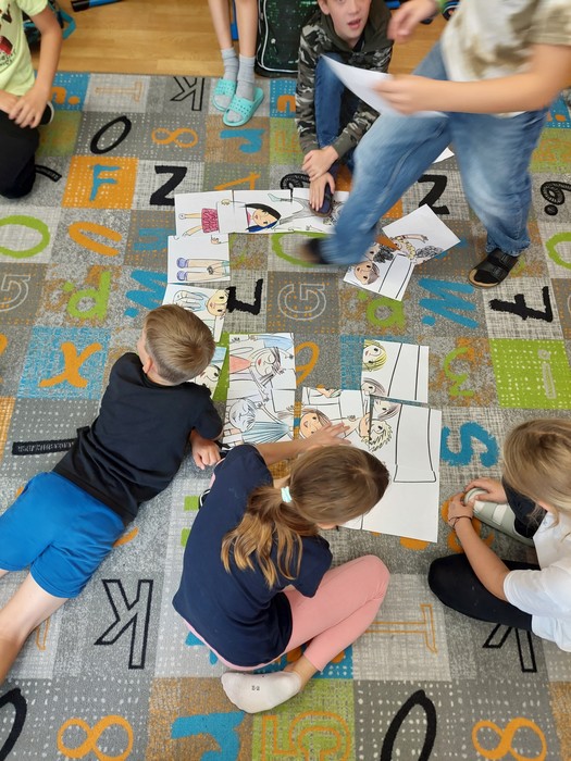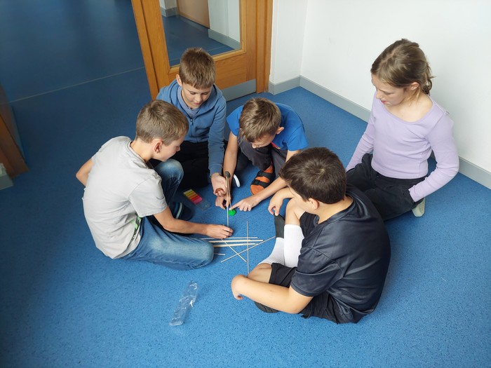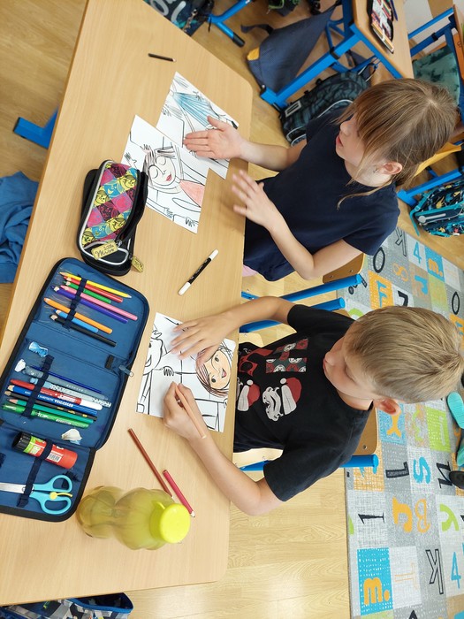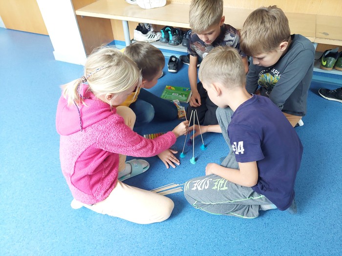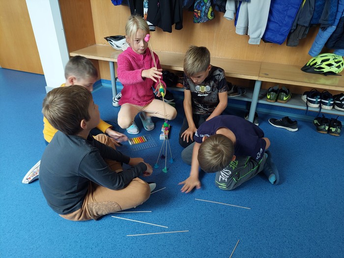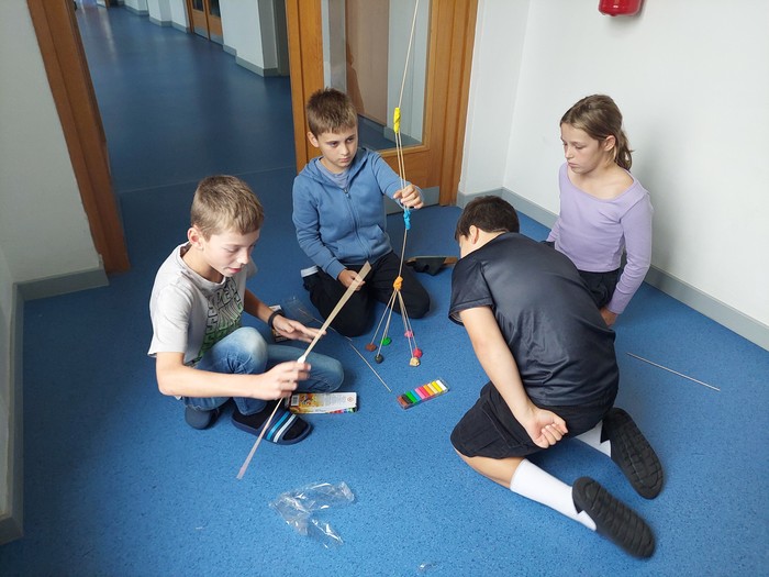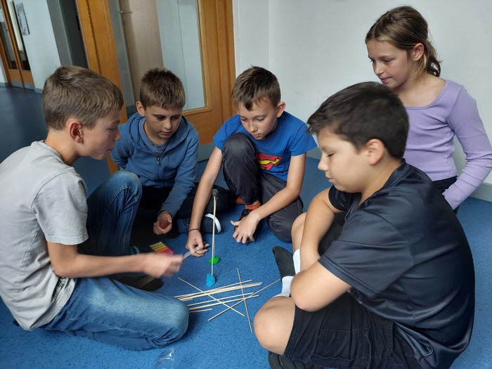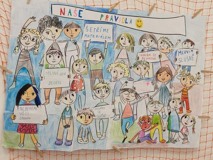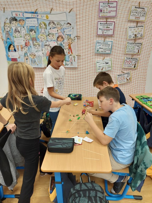 Na adaptačním pobytu si naši čtvrťáci společně vytvořili pravidla třídy a po návratu do školy je výtvarně ztvárnili pomocí kooperativní omalovánky. V rámci aktivit na podporu dobrých vztahů a spolupráce ve skupinách si také vyzkoušeli postavit co nejvyšší věž – jen s využitím jedné ruky. Při společném hodnocení jsme se zaměřili na to, kdo se ujal vedení, kdo přicházel s nápady a jak si děti poradily s řešením případných konfliktů.
