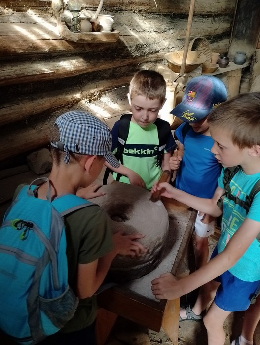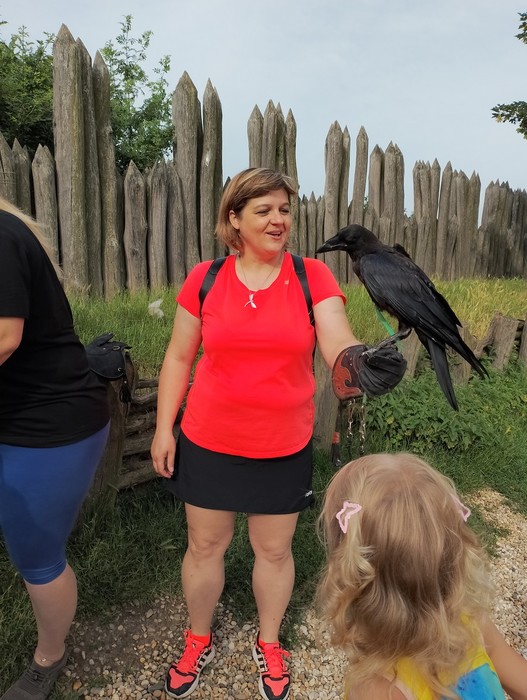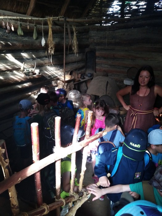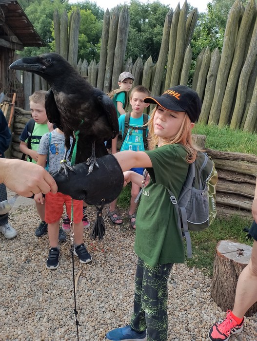 V rámci celoroční hry jsme za teplého a slunečného počasí vyrazili do Archeoskanzenu. Čekal na nás Zvonimírkův tatínek, který nám připravil zajímavý program o tom, jak Velkomoravané uměli mistrně využít přírodních podmínek, jaká řemesla ovládali nebo jak fungovala obrana hradiště. Nedílnou součástí jejich života bylo sokolnictví. Seznámili jsme se s krkavcem Bertíkem, byli jsme svědky jeho krmení a ti odvážnější z nás ho pohladili pod krkem.