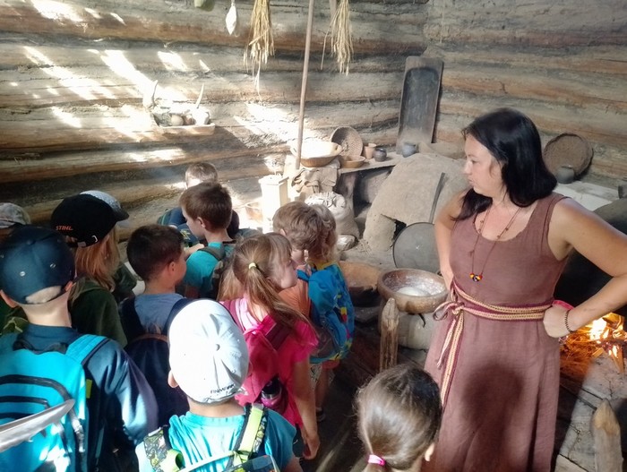 V místní škole nás čekal abbé - mnich, který vyučoval čtení a psaní. Věděli jste například, že vzdělávat se mohli jen dospívající muži? Úlohou žen bylo zajistit pokračování rodu a pečovat o potomky. Dozvěděli jsme se zajímavosti o výrobě inkoustu, čím se psalo a z jaké kůže se vyráběly pergameny, kde a jak vzniklo současné písmo a jak se lišilo od tehdejší hlaholice.