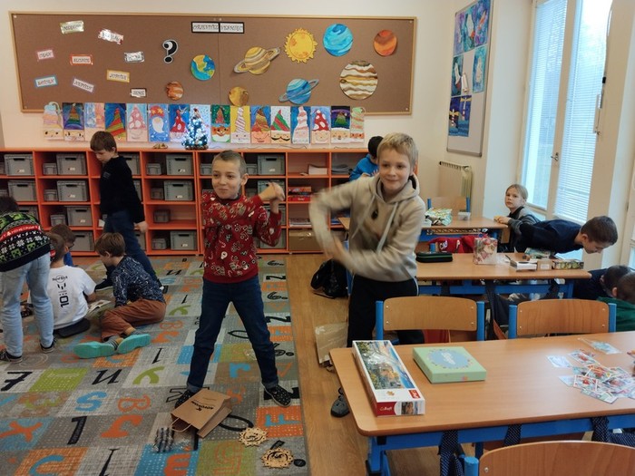 Páteční den se nesl v duchu společné třídní besídky. Třeťáci si vzájemně nadělovali dárky, hráli společenské hry, tančili Just dance i zpívali koledy. Všichni si užili mnoho veselí a radosti.