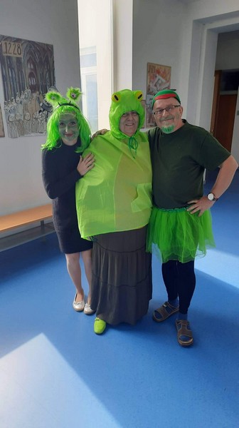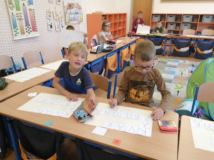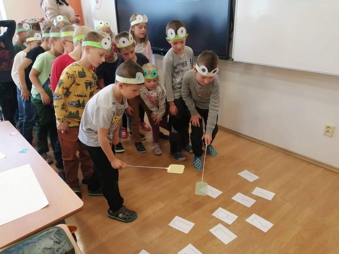 Kvak a Žbluňk ve středu přihopsali i do první třídy. Byli to zelení žabáčci jedna radost a přinesli s sebou pro děti divadlo, písničku, pohyb, nová písmenka i tvořivou práci a novou žabí čelenku.