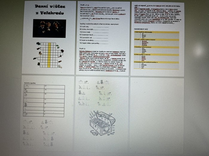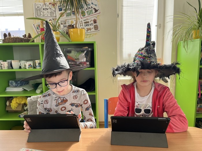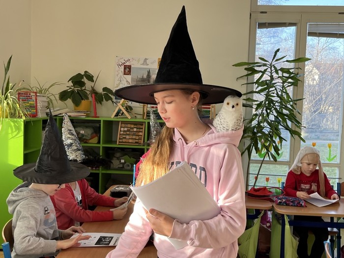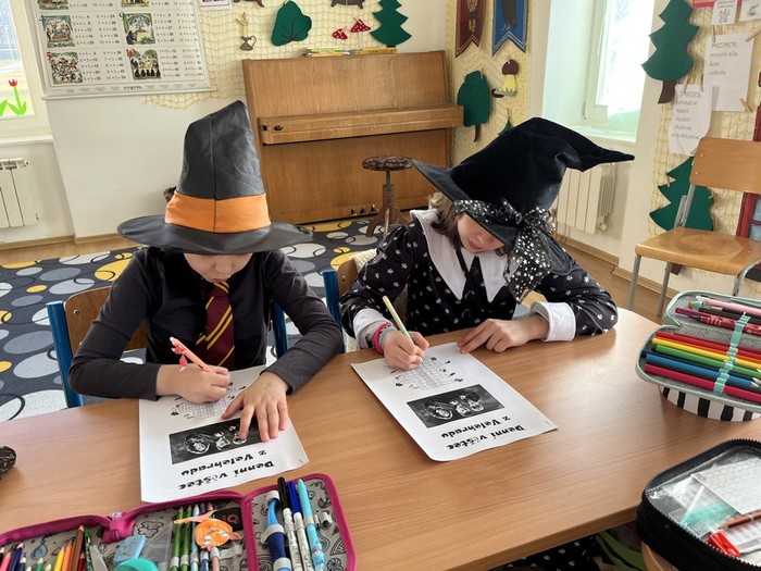 Ráno nás navštívila poslankyně z ministerstva čar a kouzel. Přinesla nám čerstvé vydání Denního věštce. Čekala nás v něm čarodějná matematika a český jazyk. Po poctivé čarodějné práci jsme si mohli užít hravou formou práci na tabletech. Zaseli jsme si čarovná semena mandragor. A mandragory také vyrobili.