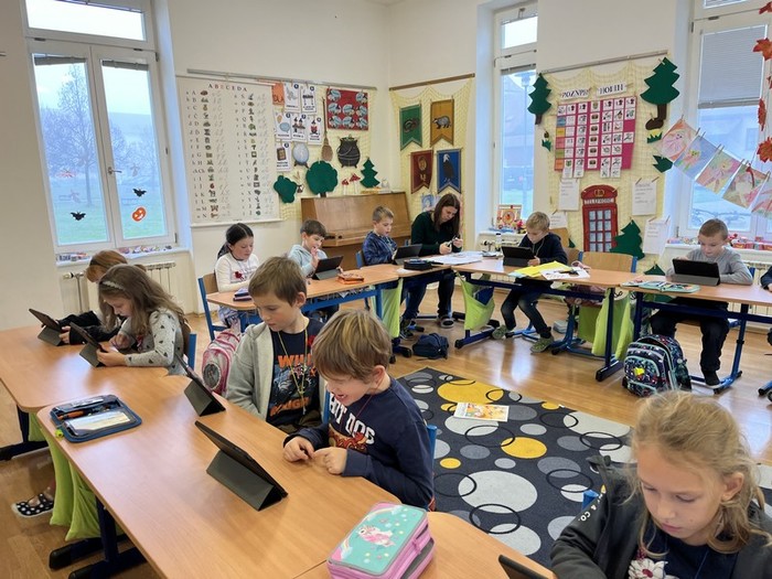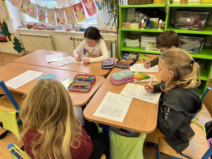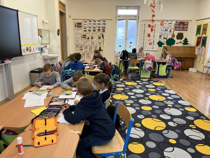 Dnes jsme plnili úkoly se svými kolejemi na stanovištích ve třídě. Na stanovišti U křišťálové koule jsme nakupovali čarodějnou výbavu, na stanovišti U Hermiony jsme řešili kvíz, S Harrym si procvičili antonyma a psaní vět, s Hermionou čarodějnou abecedu, luštili křížovku... Pracovali jsme také na I padech. Odměna za práci byla skvostná, kouzelný amulet, který nás ochrání před vším zlým :-).