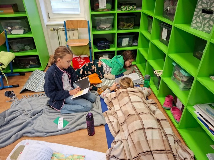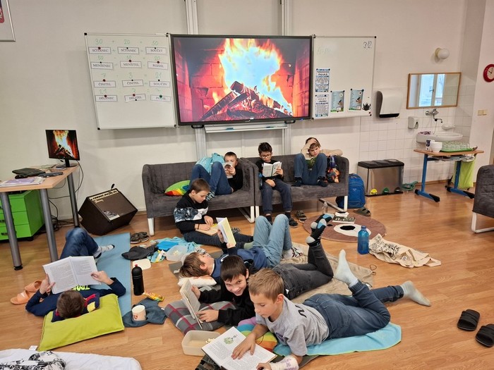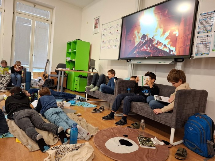 Naše třída se proměnila v útulný pokojíček. V krbu plápolal ohýnek a my jsme si četli a povídali o knížkách. K tomu popíjeli čaj a pojídali pochutiny. Někteří žáci seděli na gauči, jiní si četli ve svých postýlkách na dekách a karimatkách.