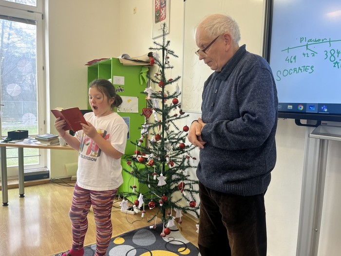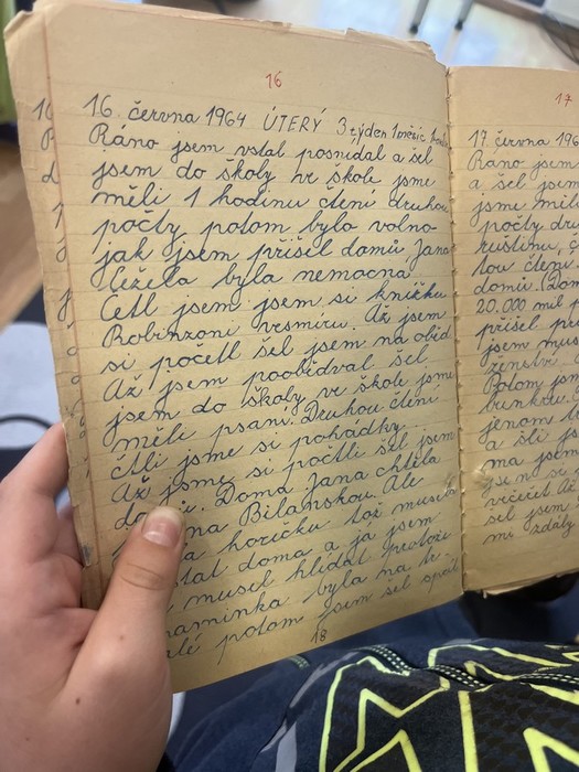 Jeníčkův dědeček nám přinesl ukázat deníky své z roku 1964 a také deníky svého tatínka. Představil nám školství v dobách minulých, povyprávěl o moudrosti, světových myslitelích, narození Ježíška, naučil nás koledu i hry z jeho dětství. Moc děkujeme!