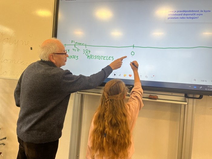 Jeníčkův dědeček nám přinesl ukázat deníky své z roku 1964 a také deníky svého tatínka. Představil nám školství v dobách minulých, povyprávěl o moudrosti, světových myslitelích, narození Ježíška, naučil nás koledu i hry z jeho dětství. Moc děkujeme!