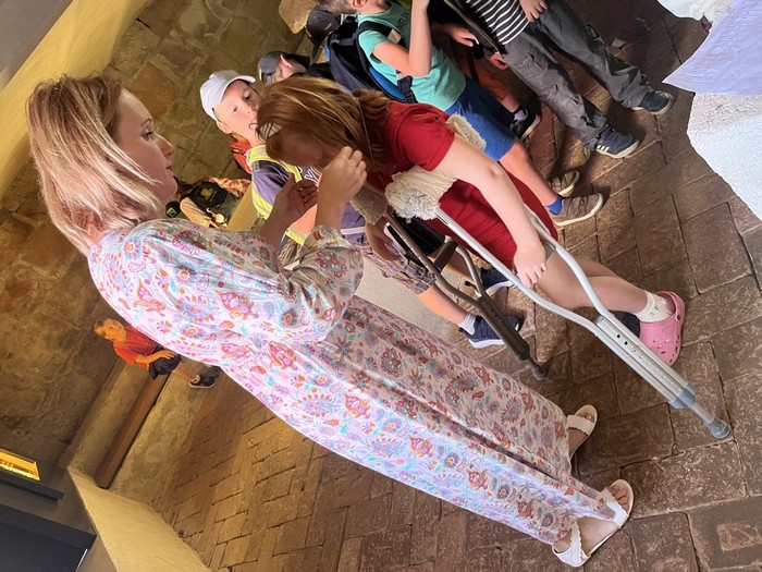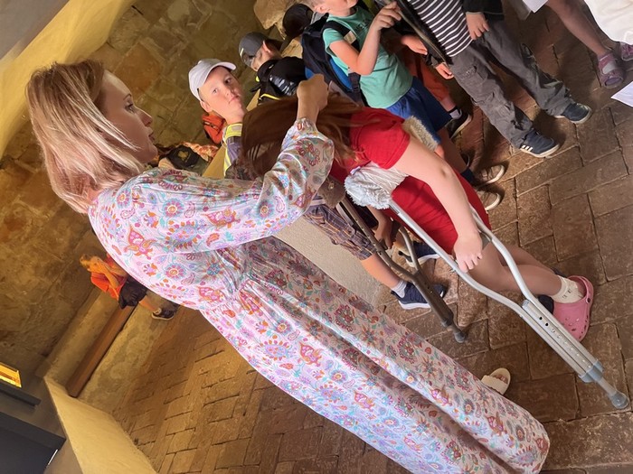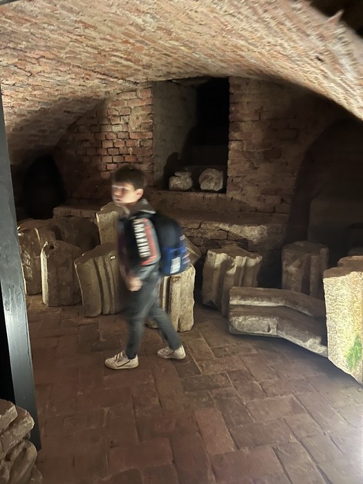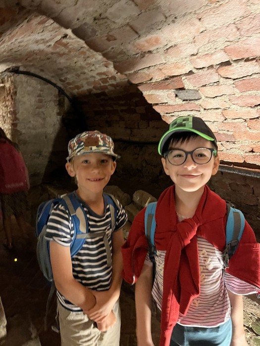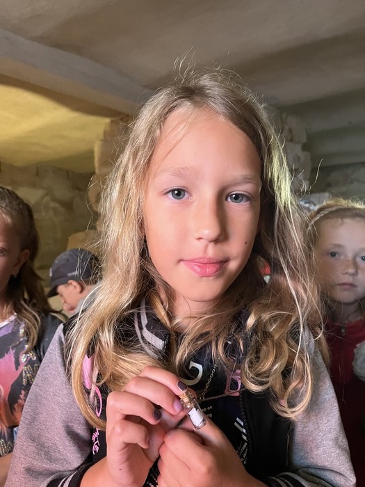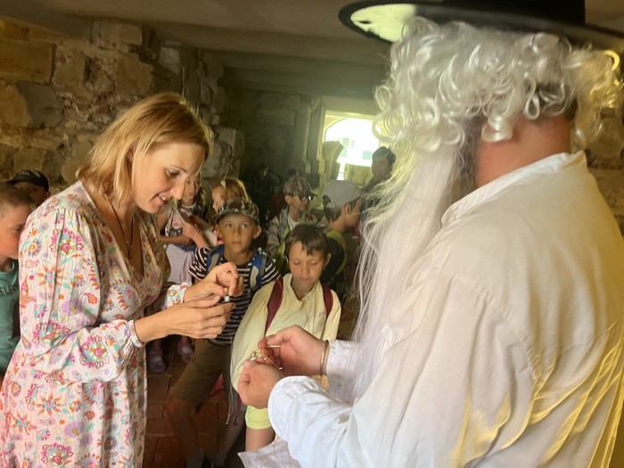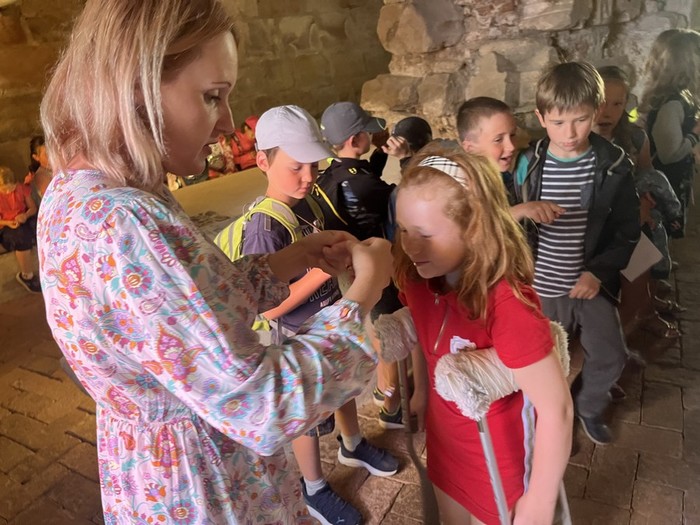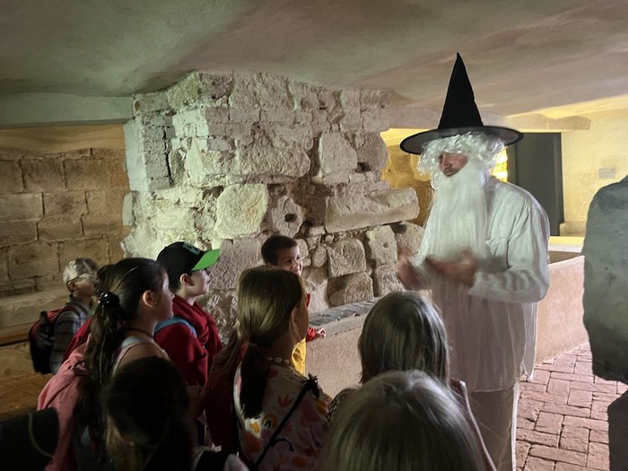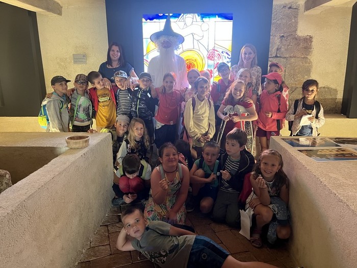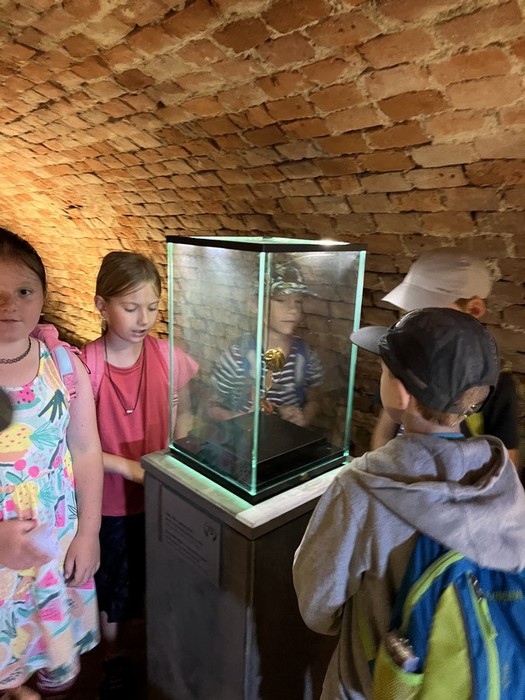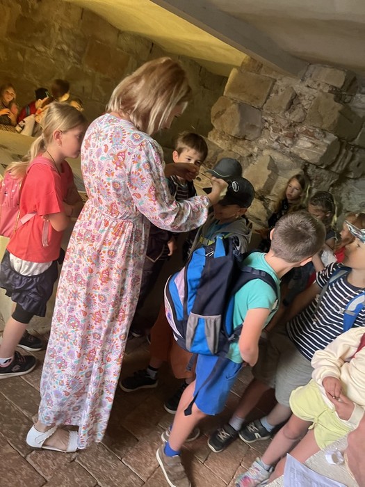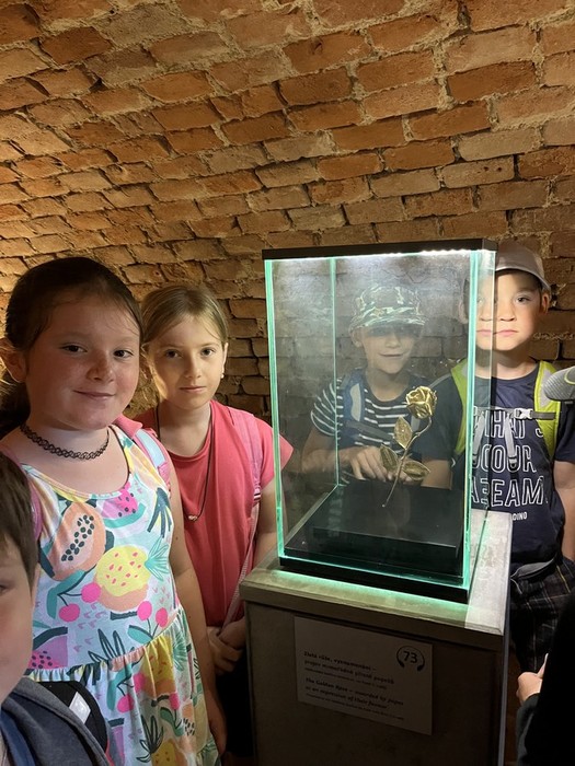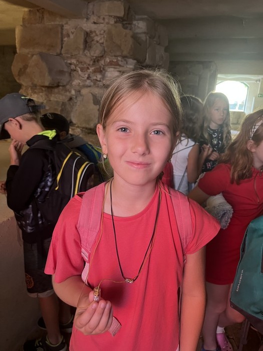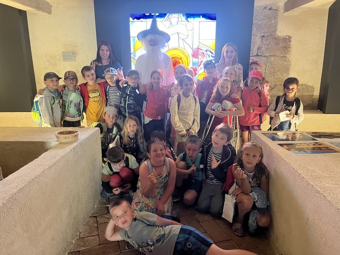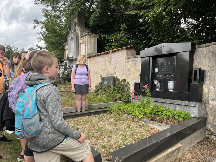 Skřítek Hlaholníček nás provedl historií okolo Cyrila a Metoděje, zkusili jsme si psát hlaholicí, potom jsme pátrali po stopách Slovanů v muzeu a v lapidáriu. Tam nás na konci okruhu čekalo velké překvapení - sám profesor Brumbál nám předal odměnu za celoroční práci na třídní hře. Ještě jsme pak zašli na hřbitov a našli hrob padlého hrdiny.