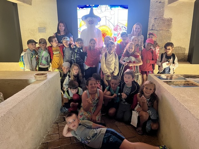 Skřítek Hlaholníček nás provedl historií okolo Cyrila a Metoděje, zkusili jsme si psát hlaholicí, potom jsme pátrali po stopách Slovanů v muzeu a v lapidáriu. Tam nás na konci okruhu čekalo velké překvapení - sám profesor Brumbál nám předal odměnu za celoroční práci na třídní hře. Ještě jsme pak zašli na hřbitov a našli hrob padlého hrdiny.