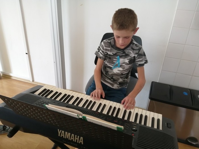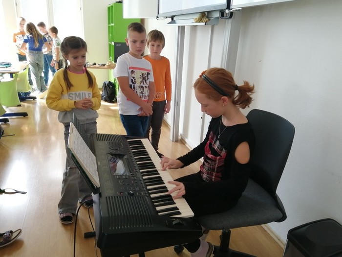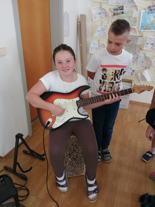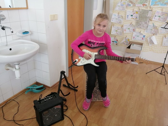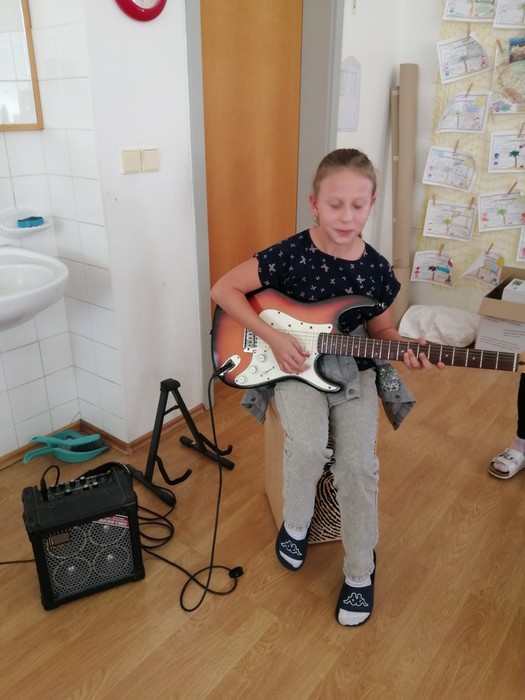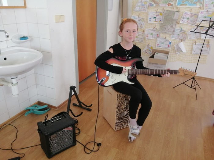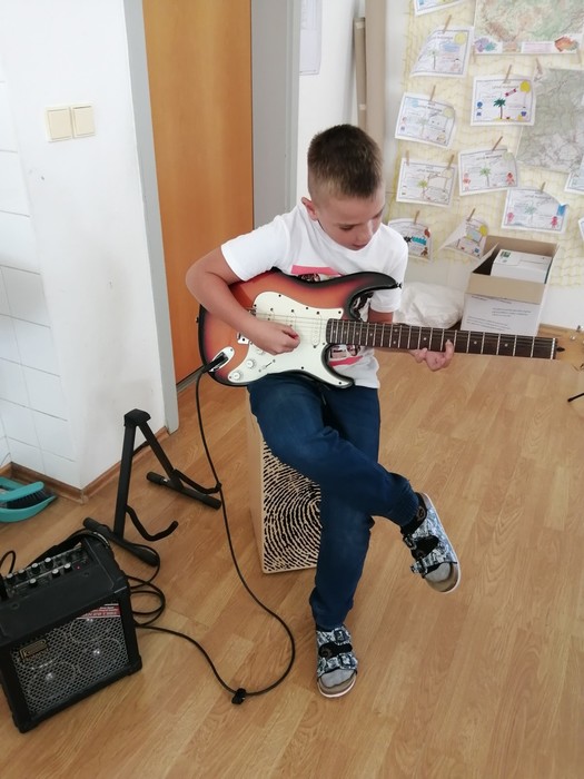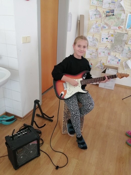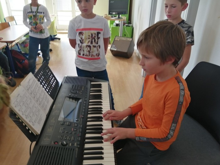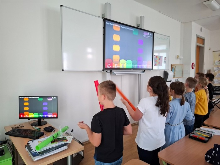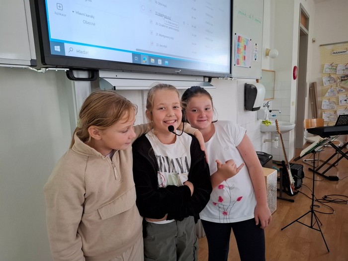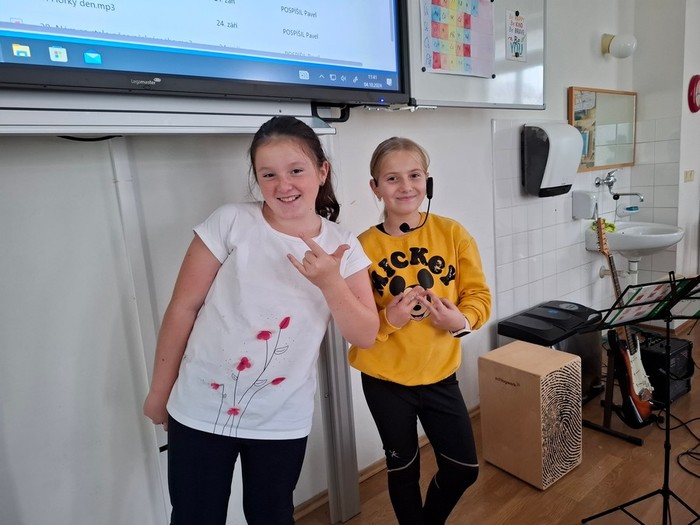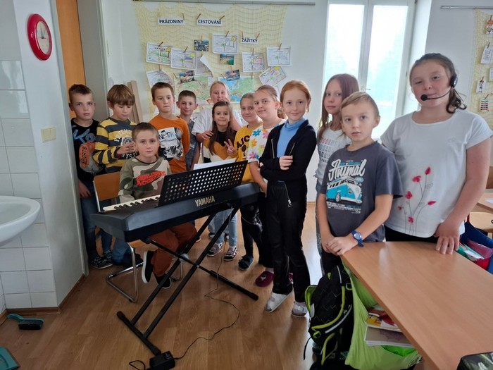 Rádi zpíváme a hrajeme, hudebka nás baví. Pan učitel nás doprovází na elektrickou kytaru, piano nebo keyboard. Zpíváme a hrajeme také k hudebním doprovodům písní, které máme uložené v aplikaci Microsoft Teams. Už jsme si i vyzkoušeli, jak se hraje na elektrickou kytaru. Někteří žáci při zpěvu používají bezdrátový mikrofon. Baví nás také hrát na Boomwhackers, rytmicky i melodicky doprovázíme písničky Boomwhackers songs, které jsou na YouTube. Rádi tančíme JustDance.